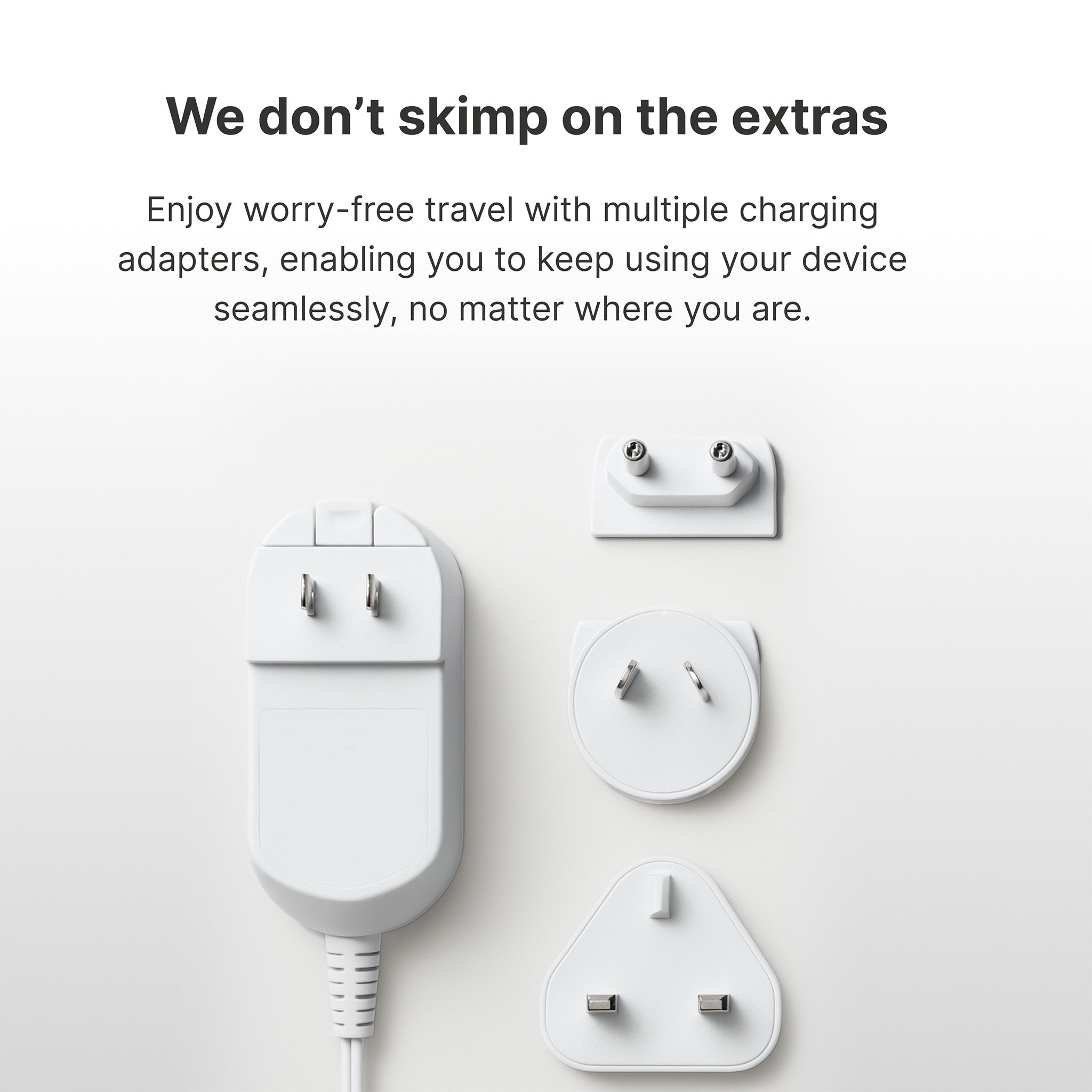 Enjoy worry-free travel with multiple charging adapters, enabling you to keep using your device seamlessly, no matter where you are.